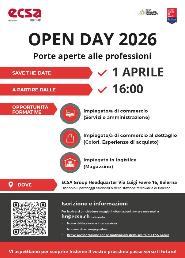 ECSA apre le porte ai giovani interessati a conoscere da vicino il mondo del lavoro e le opportunità formative per il futuro. Da anni siamo un’azienda formatrice e anche per l’anno scolastico 2026–2027 continueremo in questa direzione: l’obiettivo dell’Open Day è presentare le nostre proposte di apprendistato e far vivere un’esperienza concreta della nostra realtà aziendale.